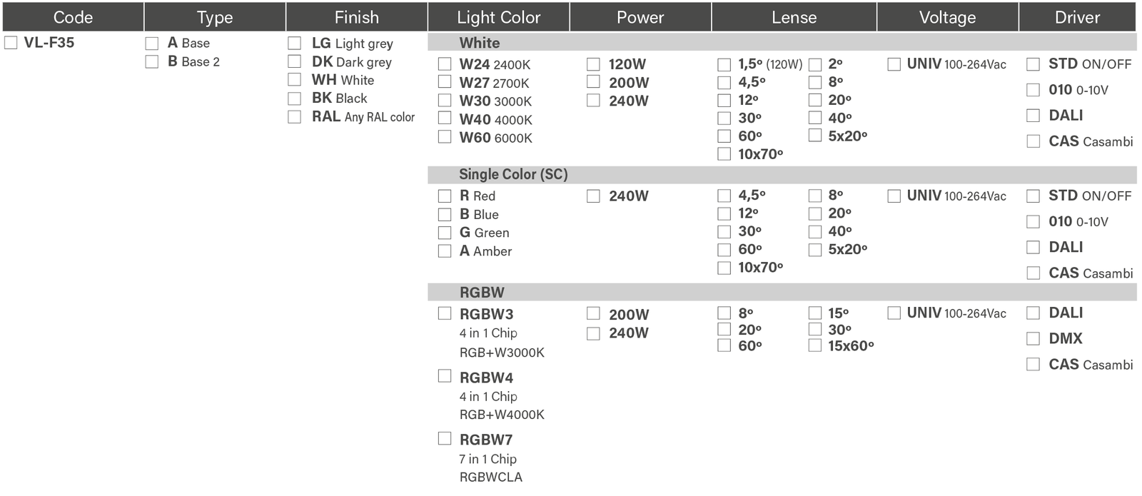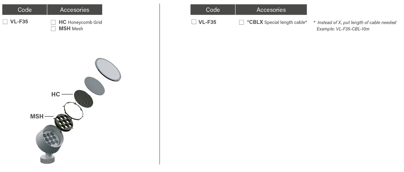 FOX 35 Downloads DataSheet .PDF Full Family .PDF Drawing .DWG Photometric .ZIP 3D Model .3DS References Reference example: VL-F35-B-BK-B-200W-10×70º-UNIV-010 Accesories