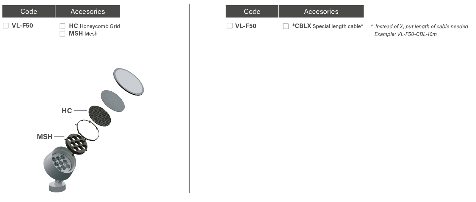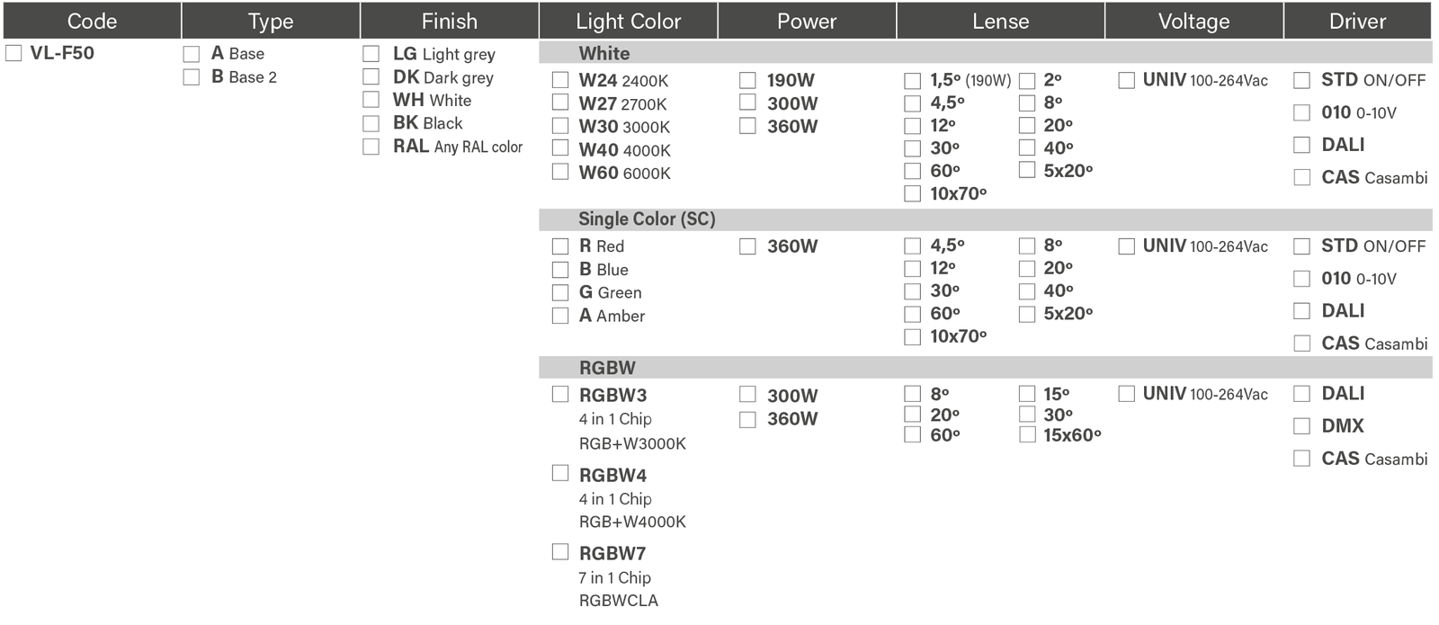 FOX 50 Downloads DataSheet .PDF Full Family .PDF Drawing .DWG Photometric .ZIP 3D Model .3DS References Reference example: VL-F50-B-BK-RGB7-36W-8º-UNIV-DMX Accesories