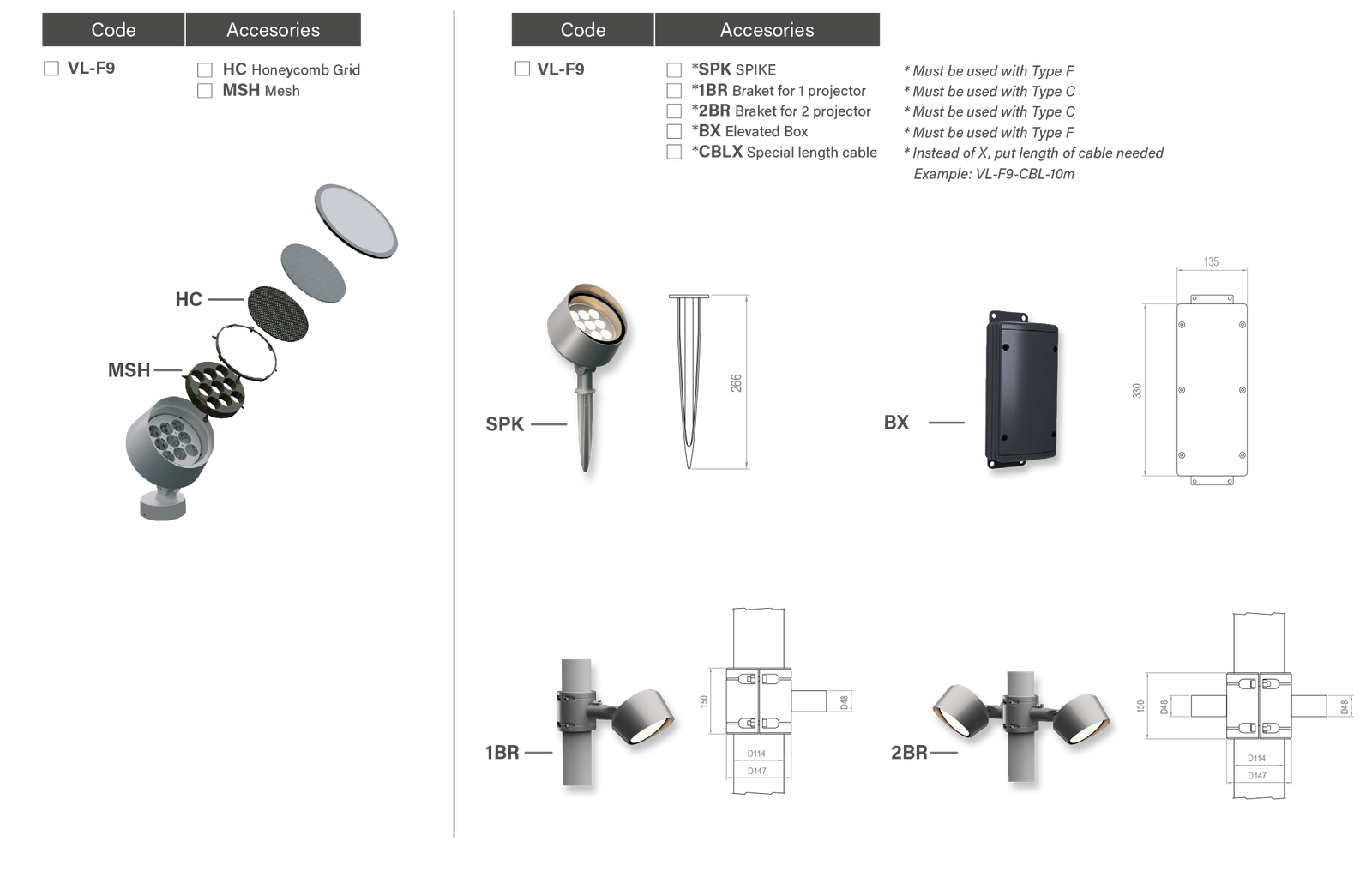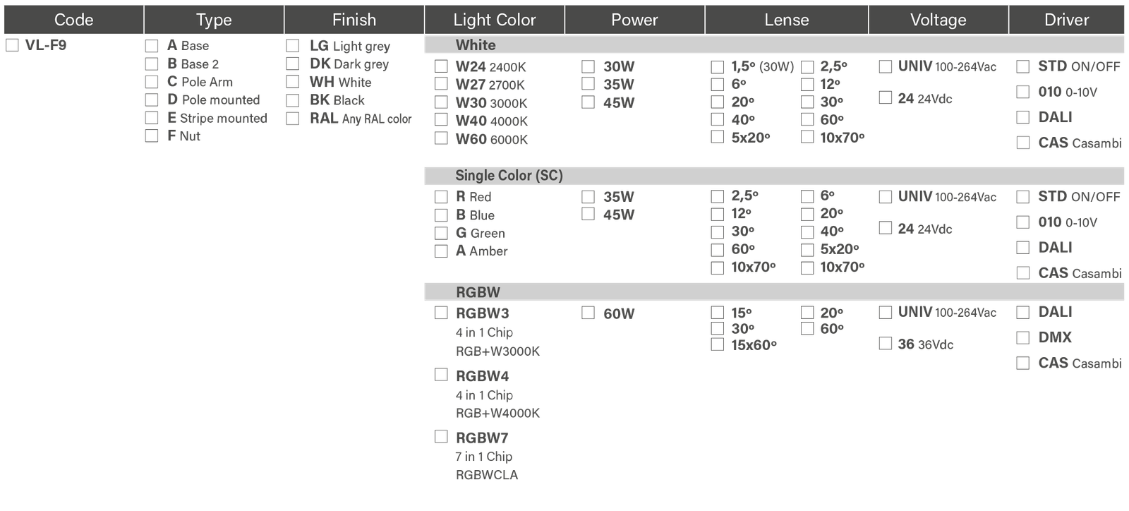 FOX 9 Downloads DataSheet .PDF Full Family .PDF Drawing .DWG Photometric .ZIP 3D Model .3DS References Reference example: VL-F9-A-DK-W30-45W-2,5º-UNIV-DALI Accesories