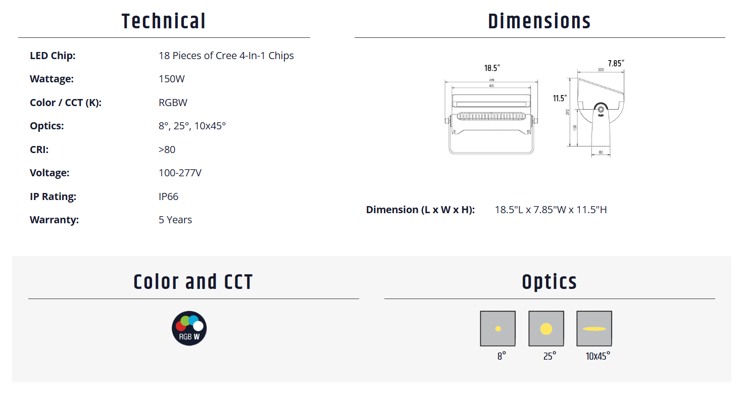 Megalux 150W RGBW Downloads DataSheet .PDF Full Family .PDF Drawing .DWG Photometric .ZIP 3D Model .3DS Specifications
