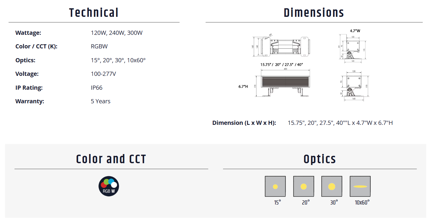 Megalux Linear 300W RGBW Downloads DataSheet .PDF Full Family .PDF Drawing .DWG Photometric .ZIP 3D Model .3DS Specifications