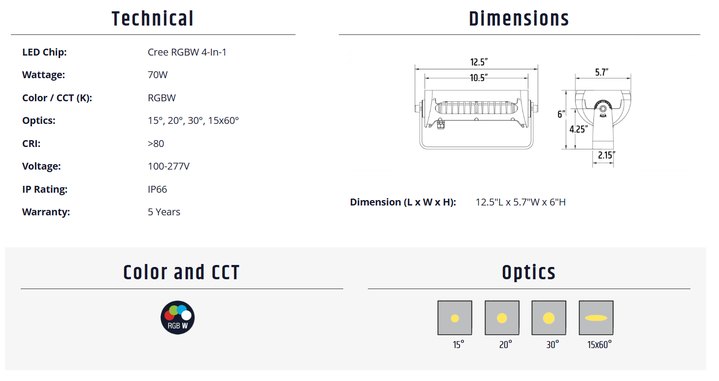 Megalux RGBW 72W Downloads DataSheet .PDF Full Family .PDF Drawing .DWG Photometric .ZIP 3D Model .3DS Specifications