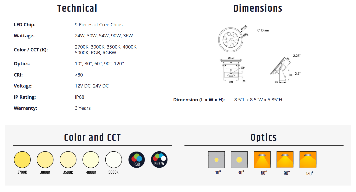 Underwater Spot/Flood 90W Description Surface mount underwater spot light RGBW is available Specifications